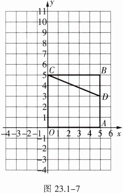 【例】 如图 23.1 - 7,正方形 $OABC$ 的两边 $OA$,$OC$ 分别在 $x$ 轴、$y$ 轴上,点 $D(5,3)$ 在边 $AB$ 上,以点 $C$ 为旋转中心,把$\triangle CDB$旋转 $90^{\circ}$,求旋转后点 $D$ 的对应点 $D'$ 的坐标。