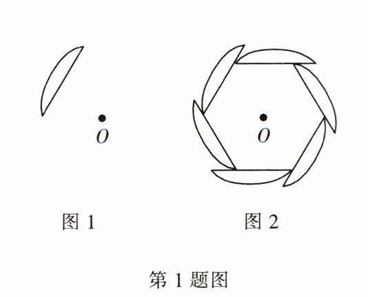 1. 利用图形的旋转可以设计出许多美丽的图案,如图 2 中的图案是由图 1 中的基本图形以点 $O$ 为旋转中心,顺时针旋转 $5$ 次而形成的,每一次旋转的角度均为 $\alpha$,则 $\alpha$ 至少为(