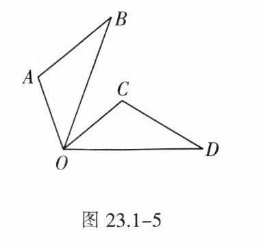 2. 如图 23.1 - 5,将$\triangle AOB$绕着点 $O$ 顺时针旋转,得到$\triangle COD$,若$\angle AOB = 40^{\circ}$,$\angle BOC = 15^{\circ}$,则$\angle BOD = $