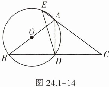【例】 如图 24.1 - 14,在 $ \triangle ABC $ 中,$ AB = AC $,以 $ AB $ 为直径作 $ \odot O $,交 $ BC $ 边于点 $ D $,交 $ CA $ 的延长线于点 $ E $,连接 $ AD $,$ DE $。