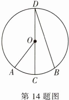 14. (2024·云南) 如图,$ CD $ 是 $ \odot O $ 的直径,点 $ A $,$ B $ 在 $ \odot O $ 上。若 $ \overset{\frown}{AC} = \overset{\frown}{BC} $,$ \angle AOC = 36^{\circ} $,则 $ \angle D = $(