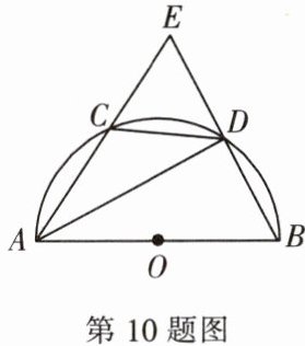 10. 如图,$ O $ 为半圆的圆心,$ C $,$ D $ 为半圆上的两点,连接 $ CD $,$ BD $,$ AD $,$ CD = BD $。连接 $ AC $ 并延长,与 $ BD $ 的延长线相交于点 $ E $。