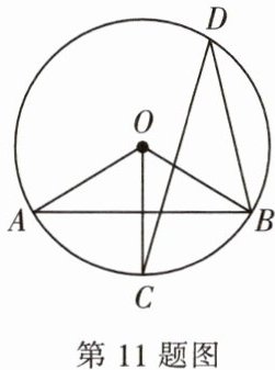 11. (2024·重庆) 如图,$ AB $ 是 $ \odot O $ 的弦,$ OC \perp AB $ 交 $ \odot O $ 于点 $ C $,点 $ D $ 是 $ \odot O $ 上一点,连接 $ BD $,$ CD $。若 $ \angle D = 28^{\circ} $,则 $ \angle OAB $ 的度数为(
