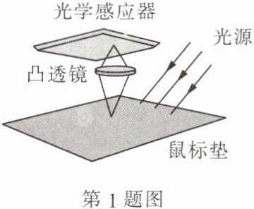 1. 光电鼠标的原理就是利用发光二极管的光照射鼠标垫,反射后经凸透镜再进入鼠标的光学感应器(相当于光屏),用以记录移动动作,以此捕捉移动位置的不同画面。图中光学感应器、凸透镜、发光二极管等组件固定在鼠标内。