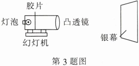 3. 下图为某同学制作的幻灯机的示意图,将一个印有图案的透明胶片插入插槽后,调节胶片到灯泡之间的距离,直至在银幕上出现清晰的像(未画出),则(