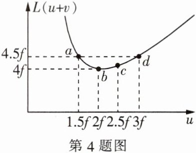 4. 在用焦距为f的凸透镜探究凸透镜成像规律时,多次实验,记录凸透镜成实像时的物距u、像距v,算出物像间距L(即u+v),绘出如下围线(以f为长度单位)。结合图像,下列说法错误的是(