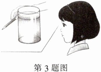 3. 将装有水的圆柱形透明玻璃瓶竖放在桌上。由近向远慢慢移动横放在玻璃瓶一侧的短铅笔,透过玻璃瓶不能看到铅笔尖所成的(