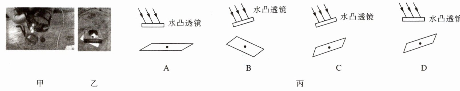 (1) 制作水透镜如图甲,矿泉水瓶瓶颈处用瓶盖画圆剪下。用502胶粘合两片圆(留针孔),注射器自针孔处注水适量如图乙。用太阳光测水透镜焦距图丙所示,操作最合理的是(