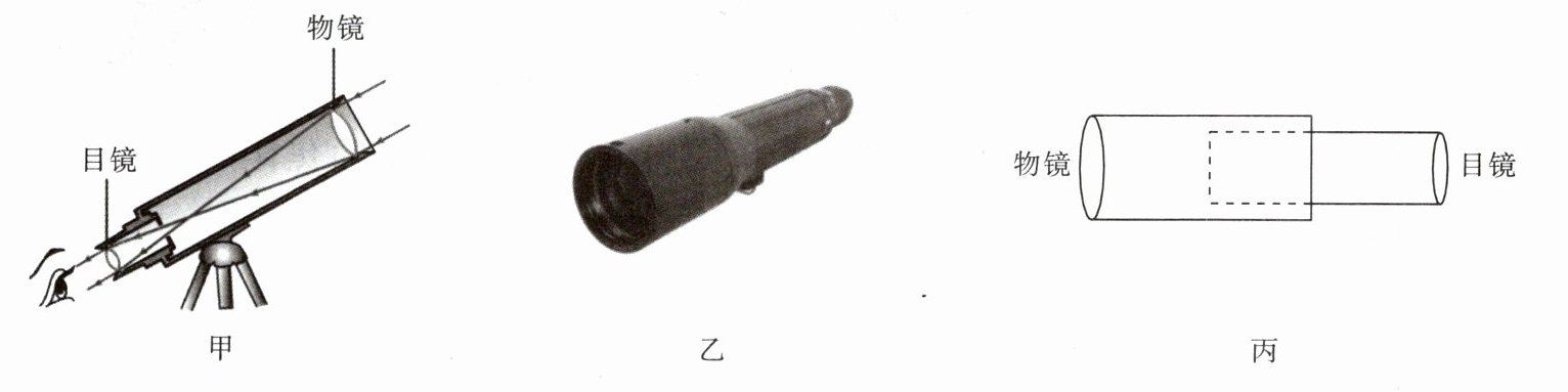 (1) 望远镜有不同类型,其中有一种望远镜是由两组凸透镜组成的 (如图甲所示)。靠近被观测物体的叫作物镜,作用是使远处的物体在焦点附近成