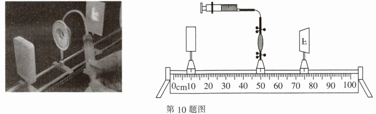 10. 某同学用弹性膜充水制作了一个水凸透镜,通过注射器注水或抽水改变透镜的厚度,如图是他用其模拟眼睛看物体的实验装置。模拟正常眼睛时,固定透镜,将一个F形光源放在合适的位置后,调节光屏得到清晰的像,下列说法正确的是(