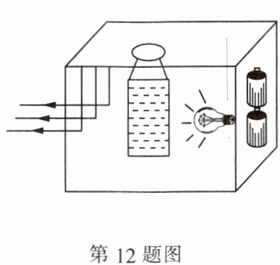 12. 根据所学透镜知识,某同学自制了一个“平行光源”,如图所示,装置的主要部分是开有细缝的小盒、充满水的小药瓶、小灯泡、电池、导线等,其中,装水的小药瓶可对光起