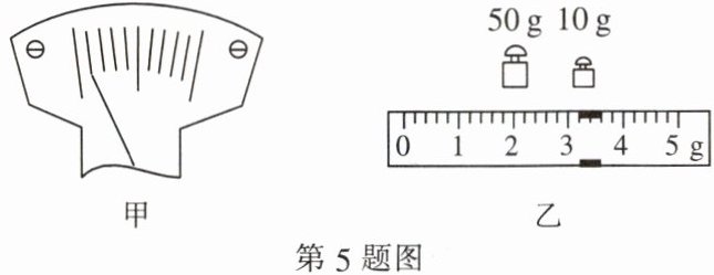 5. 某同学用天平测量石块的质量。他将天平放在水平桌面上,将游码移至标尺左端零刻度线时发现指针位置如图甲所示。为使天平的横梁水平平衡,则应向