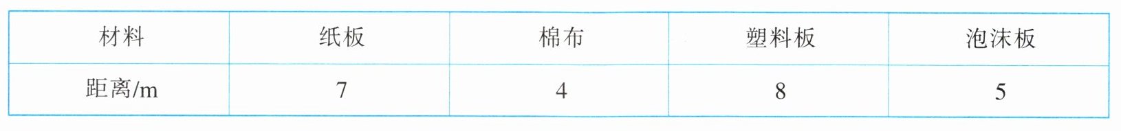 把手机放置在不同材料制成的模型内,逐步远离声源,直至听不到手机的声音为止,数据如下: