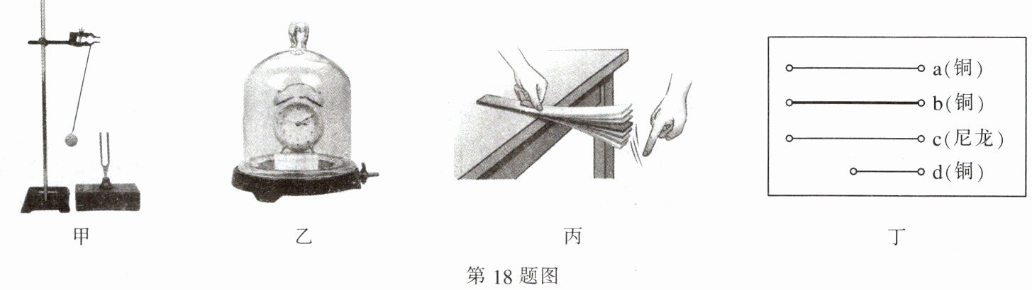 (选填“响度”“音调”或“音色”)会发生改变。(4)某研究小组利用两个纸杯和一些长短、粗细不同的琴弦,又进行了探究“音调与哪些因素有关”的活动。他们选用的琴弦长度、材料在图丁中已标出(其中琴弦的直径关系:a= c= d<b),并且每根琴弦固定在“音箱”上的松紧程度一致。为了研究音调与琴弦粗细的关系,应该选择琴弦