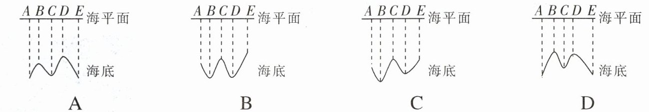 (3)科考船对某海域的海底形状利用声呐系统进行了测绘。具体方法:在经过该海域水平面的A、B、C、D、E五个位置时,向海底定向发射超声波,测得回收信号的时间分别为0.40 s、0.26 s、0.40 s、0.24 s、0.40 s。根据时间,求出海底与海平面的距离,就可以绘出海底的大致形状,则该海域海底的大致形状如图中的______
