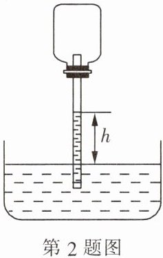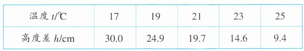 某小组同学利用小塑料瓶、细管、软木塞、水槽等制作了一个简易的伽利略温度计,如图所示,并利用它测出了不同温度下细管内外液面的高度差$h$。测量数据记录在下表中。