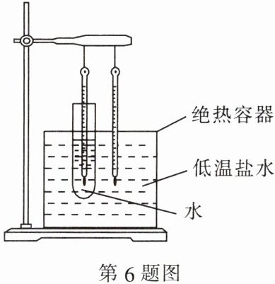 6. 某同学在探究“水凝固时,温度与时间的关系”的实验时,还想探究“水凝固成冰的过程中是吸热还是放热的”。为此使用如图所示的实验装置进行实验:在绝热容器内装满低温盐水,将装有冷水的试管插入盐水中,两支温度计分别测量水和盐水的温度。