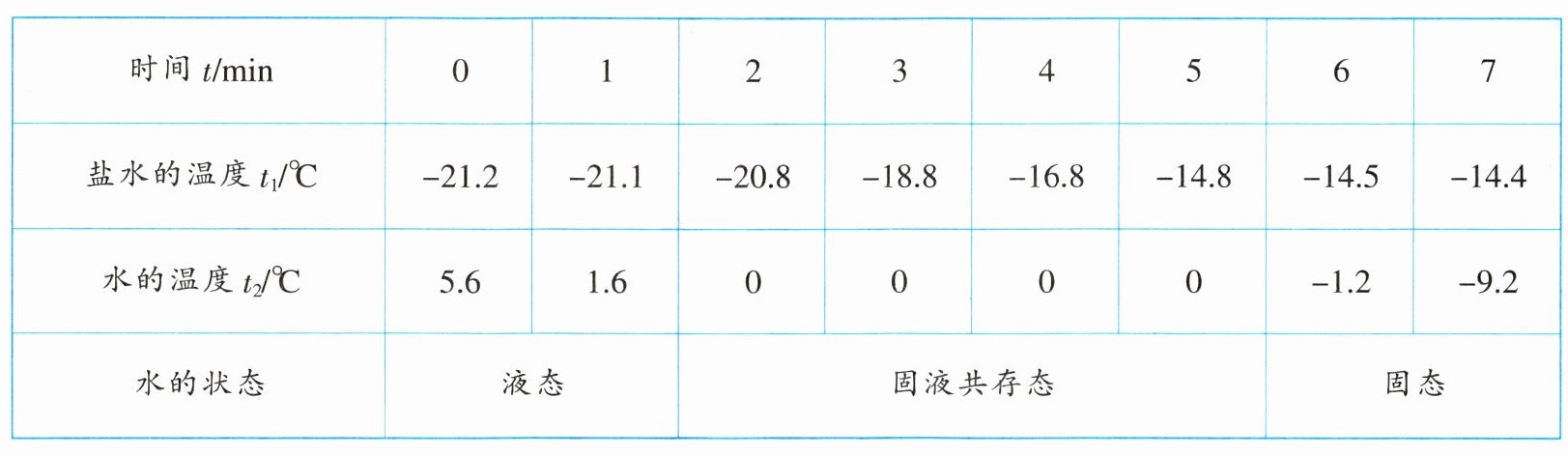 (1)秒表 (2)水处于固液共存态 (3)保持不变 (4)放 盐水温度升高,说明盐水吸收热量,因为绝热容器中盐水只与水接触,说明水凝固时放出热量