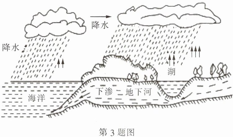 3. 如图是大自然中水循环现象的示意图。江、河、湖、海以及大地表层中的水不断蒸发变成水蒸气。当含有很多水蒸气的空气升入高空时,遇冷