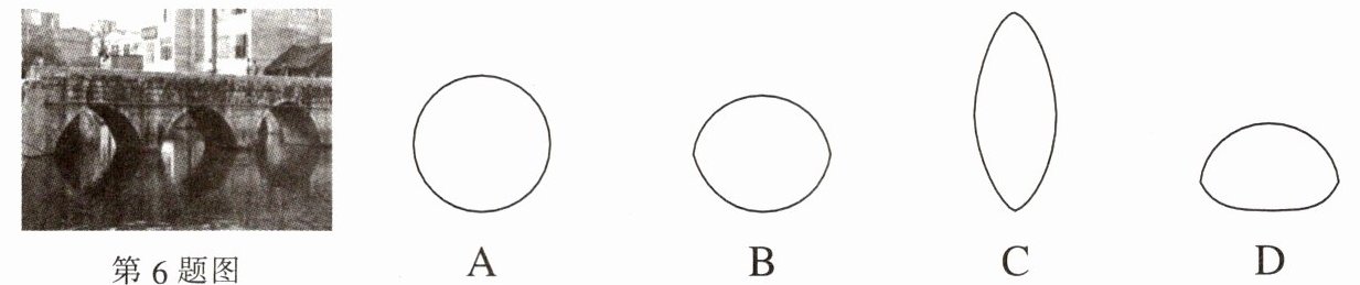 6. 如图所示,平静的水面上有一座石桥,桥孔看上去是圆形的。当水面上升时,看到的桥孔的形状是下图中的(