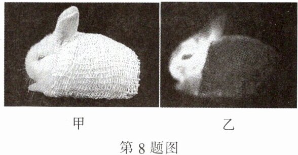 8. 浙江大学科研人员研制了一种神奇织物,给白兔身体披上该织物,如图甲所示。用红外照相机拍摄到的照片上,兔子部分身体“隐形”了,如图乙所示。兔子身体“隐形”是因为该织物(
