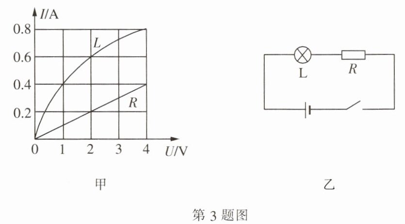 3. 灯泡 $ L $ 和定值电阻 $ R $ 的电流与其电压的关系如图甲所示,则定值电阻 $ R $ 的阻值为
