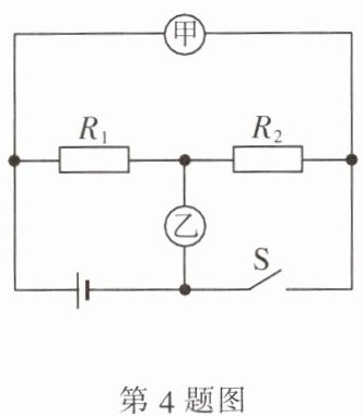 4. 如图所示电路,电源电压不变,$ R_1 = 12 \Omega $,$ R_2 = 6 \Omega $,当开关 $ S $ 闭合,甲、乙都是电压表时,两表的示数之比 $ U_{甲} : U_{乙} = $