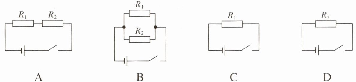 5. 现有两个电阻 $ R_1 $、$ R_2 $,且 $ R_1 > R_2 $,如图中电路总电阻值最大的是(