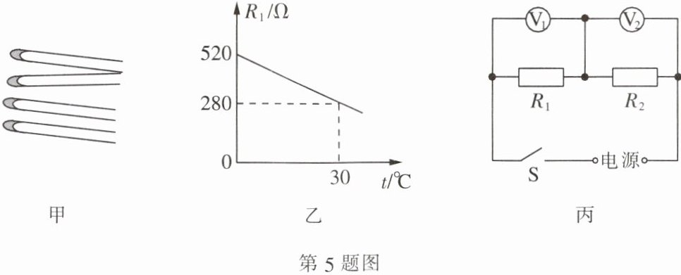 (选填“变大”“变小”或“不变”)。(3) 某次测温时,$ V_1 $ 表盘上显示的温度是 $ 20 ^ { \circ } C $,此时电源电压为