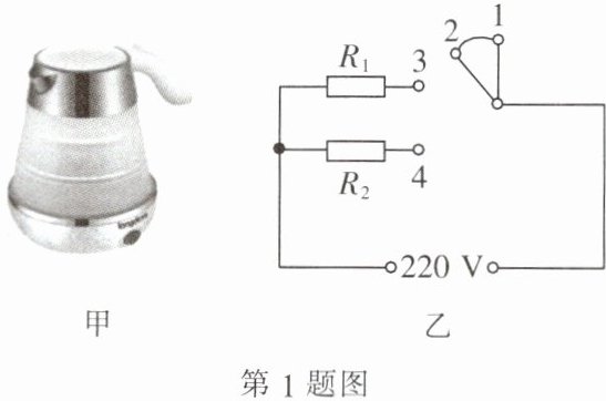 1. 如图甲所示是便携式可折叠电热壶,该型号电热壶的额定电压为 $ 220\ V $,具有加热、保温两挡。保温挡的额定功率为 $ 200\ W $,内部简化电路如图乙所示,双触点开关只能在触点 1 和 2、2 和 3 及 3 和 4 之间切换。 $ R_{1} $、 $ R_{2} $ 是两个阻值不变的发热元件, $ R_{2}= 60.5\ \Omega $,现将此电热壶接到 $ 220\ V $ 的家庭电路中。求:
