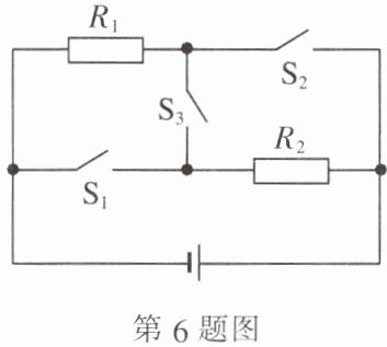 6. 某实验小组自制电加热器时,设计的电路图如图所示。 $ R_{1} $、 $ R_{2} $ 都是电热丝,其中 $ R_{1} $ 的电阻是 $ 20\ \Omega $,电源电压是 $ 30\ V $。只闭合 $ S_{3} $,电路处于低温挡,加热器的功率是 $ 18\ W $;只闭合 $ S_{1} $、 $ S_{2} $,电路处于高温挡。求: