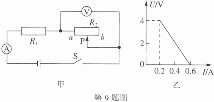 9. 如图甲所示的电路$,R_1$为定值电阻$,R_2$为滑动变阻器,电源电压为6V且保持不变。闭合开关S,滑片P从b端移动到a端的过程中,电压表的示数U与电流表的示数I的关系如图乙所示。下列判断正确的有(