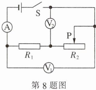 8. 在如图所示的电路中,闭合开关S,电压表$V_1$的示数恒为6V,当把滑动变阻器的滑片移至某位置时,电流表A的示数为0.5A,电压表$V_2$的示数为4V;当把滑动变阻器的滑片移至最右端时,电流表的示数为0.3A,则下列物理量的结果正确的有(