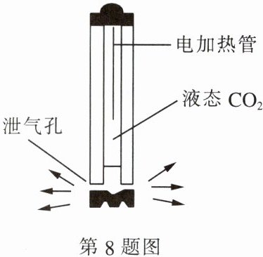8. 二氧化碳$(CO_2)$爆破技术是现代工程建设中非常环保的技术,起爆前高压泵将$CO_2$压缩成高压气体,液化后输入爆破筒内。如图所示,爆破时电加热管发热。使筒内的液态$CO_2$迅速汽化,形成的高压气体从泄气孔中喷出,实施爆破。下列说法正确的是(