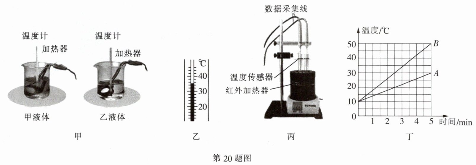 (5)同桌王同学在做该实验时所用实验装置如图丙所示,他用铁夹将温度传感器及分别盛有质量相同的A、B两种液体的试管固定在铁架台上,温度传感器的探头部分与试管内的两液体良好接触,传感器通过数据采集线与计算机连接,实验结束后得到实验图像如图丁所示。可以得出______