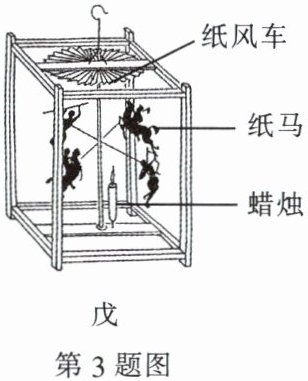 (6) 如图所示是流行于民间的“走马灯”,点燃走马灯底部的蜡烛时,燃烧产生的高温高压气体向上运动,推动纸风车和固定在转轴上的纸马转动,在此过程中