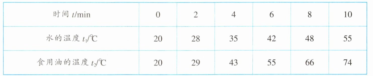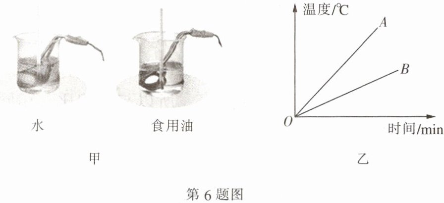 6. 某班级同学探究“比较不同物质吸收热量的情况”的实验,实验装置如图甲所示。用两个相同的烧杯分别装有质量与初温都相同的水和食用油,用相同的电加热器加热。