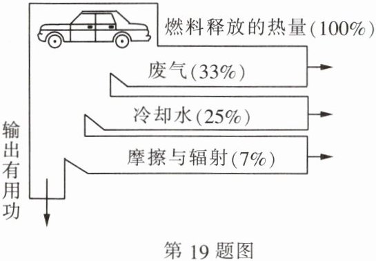 19. (5 分)如图所示是某品牌汽车汽油机的能量流程图,某次该汽车行驶过程中消耗了 0.1 kg 汽油。求:[汽油的热值为 $ 4.2 × 10^7 $ J/kg,水的比热容为 $ 4.2 × 10^3 $ J/(kg·°C)]