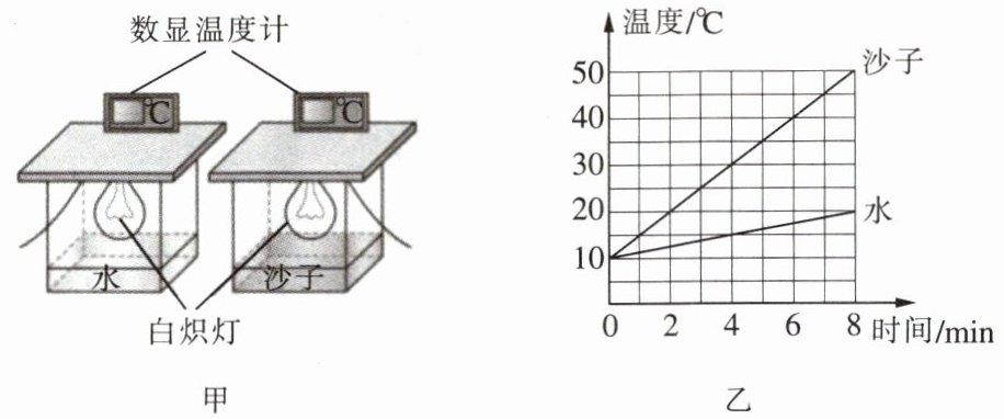 (2) 依据实验数据描绘的水和沙子的温度随时间变化的图像如图乙所示,可知在相同时间内,沙子升高的温度比水升高的温度