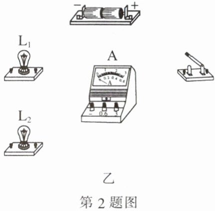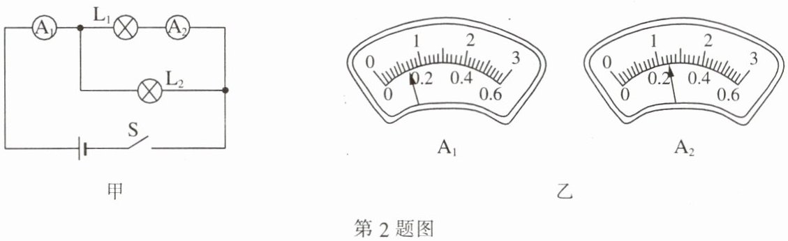 2. 如图甲所示的电路,电流表$A_1与A_2$的指针的位置如图乙所示,电流表$A_1$使用的测量范围是
