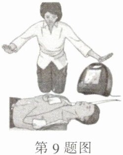 9. 自动体外除颤器又称自动体外电击器(简称AED),它可以诊断特定的心律失常,并且给予电击除颤,从而抢救心脏骤停患者。如图所示,急救人员正在对一位心脏骤停患者实施电击除颤:将AED的两个电极贴于患者身上,按下“放电”键即可帮助患者心肺复苏。此过程中,任何人都不与患者接触。下列有关分析正确的是(