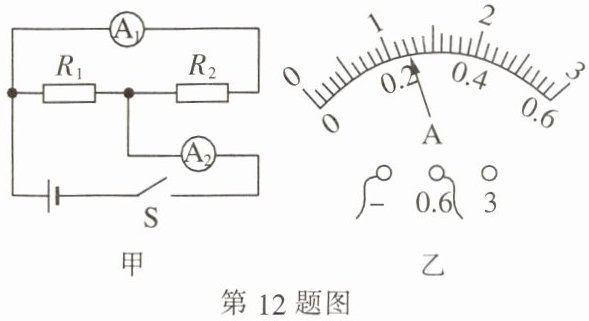 12. 在图甲所示的电路中,闭合开关S后,电流表A₁指针与电流表A₂指针偏转相同,如图乙所示,则通过R₁的电流为