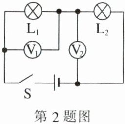 2. 如图所示的电路,电源电压为$6V$,电压表$V_1的示数为U_1 = 1.5V$,则电压表$V_2的示数U_2= $