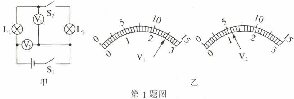 1. 如图甲所示的电路,闭合开关$S_1$、$S_2$,电压表$V_1$、$V_2$的示数如图乙所示。则$L_1$两端的电压是