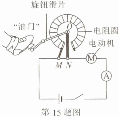 15. 如图为电动汽车“油门”模拟图。脚往下踩“油门”时,滑片绕O点在电阻圈上逆时针转动,此时接入电路的电阻变
