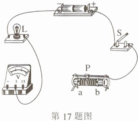 17. 如图所示的电路中,有两根导线尚未连接,请用笔画线代替导线补上。要求:①电压表测小灯泡两端电压;②闭合开关S,向a端移动滑动变阻器的滑片P,小灯泡变亮。