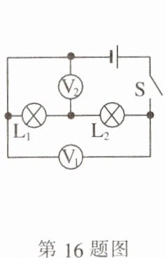 16. 如图所示的电路,闭合开关后,电压表$V_1$的示数为8 V,电压表$V_2$的示数为2.6 V,则灯$L_1$两端的电压为