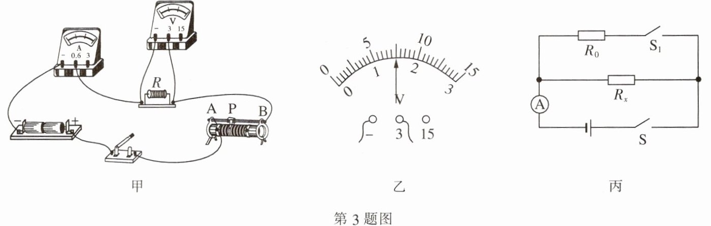 (2)闭合开关,移动滑动变阻器滑片,观察电压表的示数。如图乙所示,电压表的示数为______ $ V $;电流表示数为 $ 0.3 A $,可计算出电阻器 $ R $ 的阻值为______ $ Ω $。