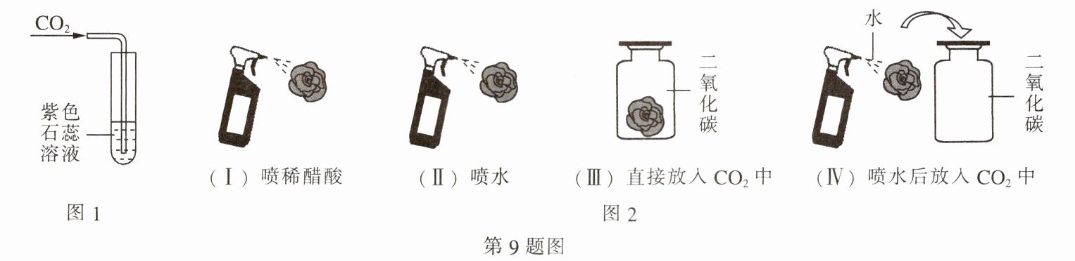 9. 为了探究二氧化碳是否能与水发生反应,甲、乙两位同学分别设计了探究实验的方案。甲同学的实验方案是将二氧化碳通入紫色石蕊溶液中,观察溶液的颜色变化,如图1所示。乙同学的实验方案是取四朵用石蕊溶液染成紫色的干燥小花,按图2进行实验,观察小花的颜色变化。请你对甲、乙两位同学的实验探究方案的合理性进行反思。