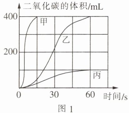 (2) 同学们选择制取二氧化碳的试剂时,按下表进行实验,取等质量的大理石加入足量酸中(杂质不与酸反应),产生二氧化碳的体积随时间变化的曲线如图1所示。